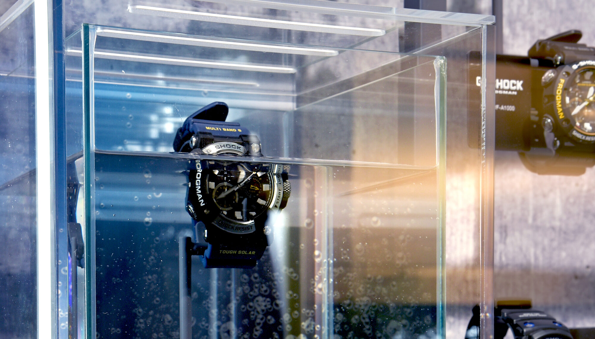 A kinetic display was central to the setup, drawing customer attention and showcasing the watch’s resilience in a dynamic way. The movement added a visually engaging layer to the display, encouraging interaction and emphasizing the product’s rugged features. Accent lighting was used strategically to highlight specific details, directing focus to the Gravity Master watch and creating an impactful visual that aligned with the brand’s tough, high-performance image.
