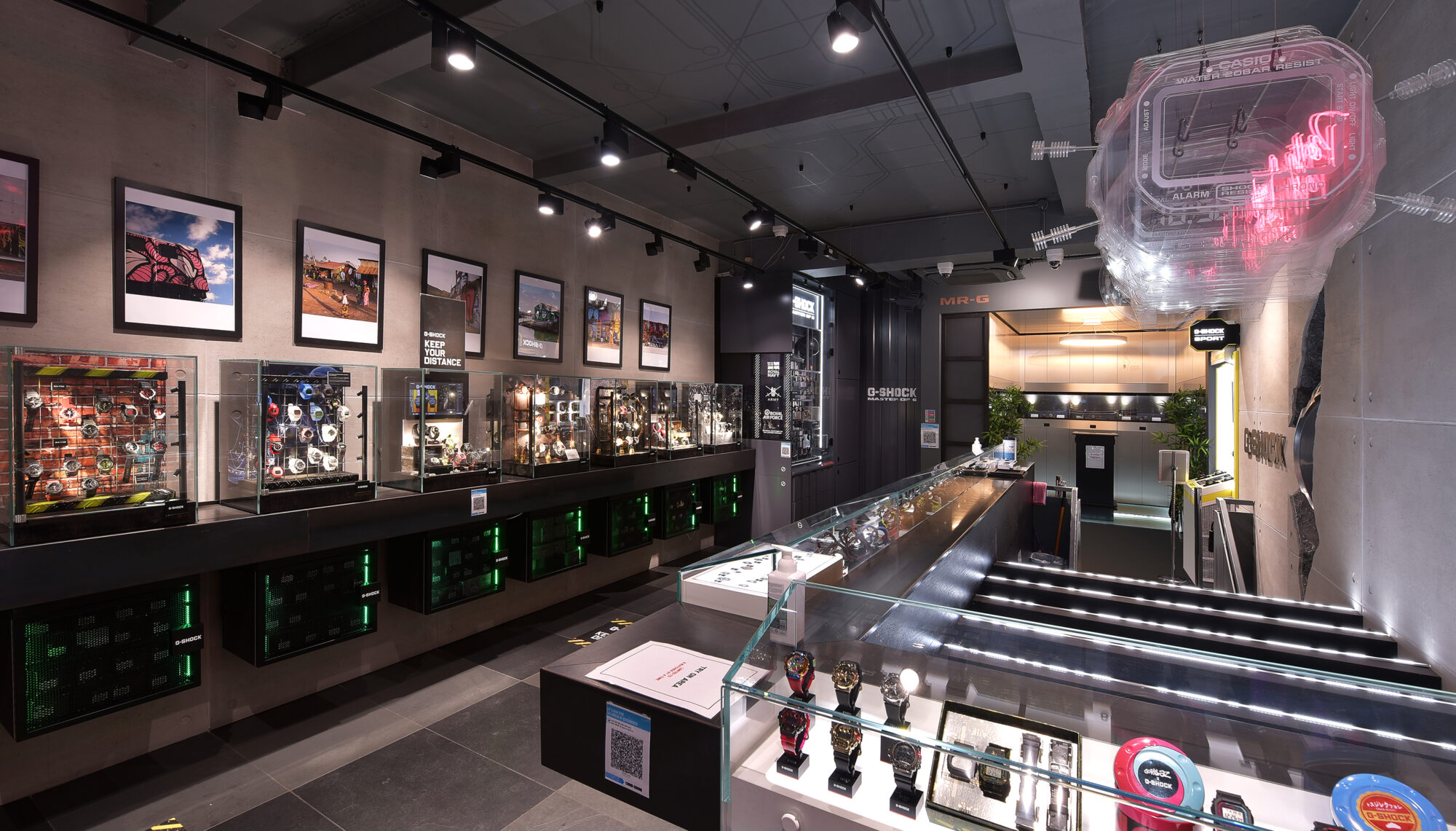 The industrial materials, kinetic display, and focused lighting work together to engage customers, creating an interactive and memorable experience that communicates the watch’s resilience and connection to military standards. This installation serves as a strong visual and functional showcase, reinforcing the G-Shock brand’s identity in the retail space.