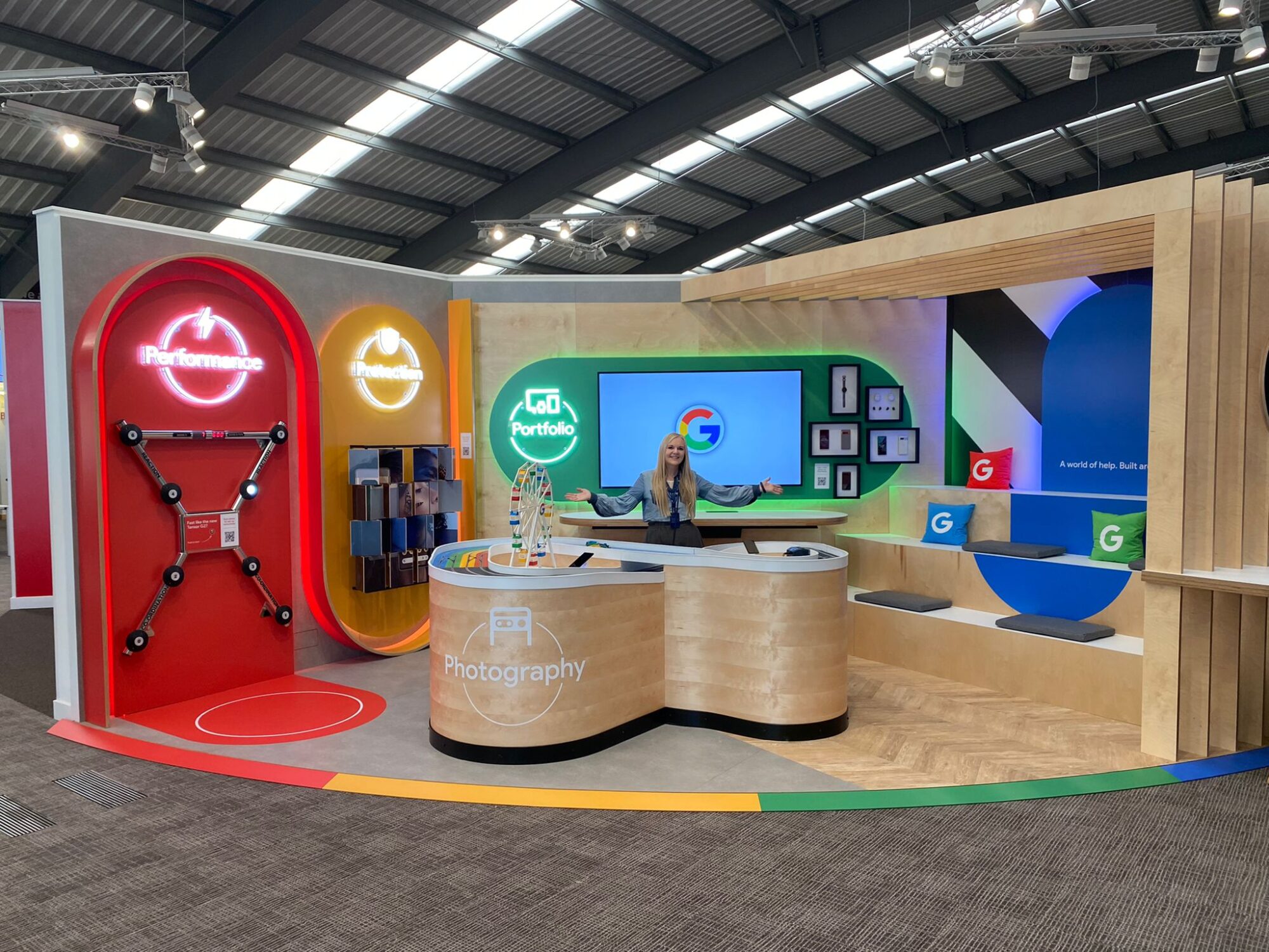 The initial design included a Performance Zone, featuring a Batak game paired with Google wearable technology to track heart rates in real-time, demonstrating its practical applications. The Protection Zone introduced an exciting 3D puzzle that highlighted Pixel device security features, while the Portfolio Zone served as a digital product showcase with an interactive 75-inch touchscreen. Finally, the Photography Zone combined gaming and Pixel 7’s advanced photography capabilities, enabling users to control an F1 Scalextric track while exploring features like motion blur. These immersive spaces fostered hands-on learning and reinforced Google’s innovative brand identity.