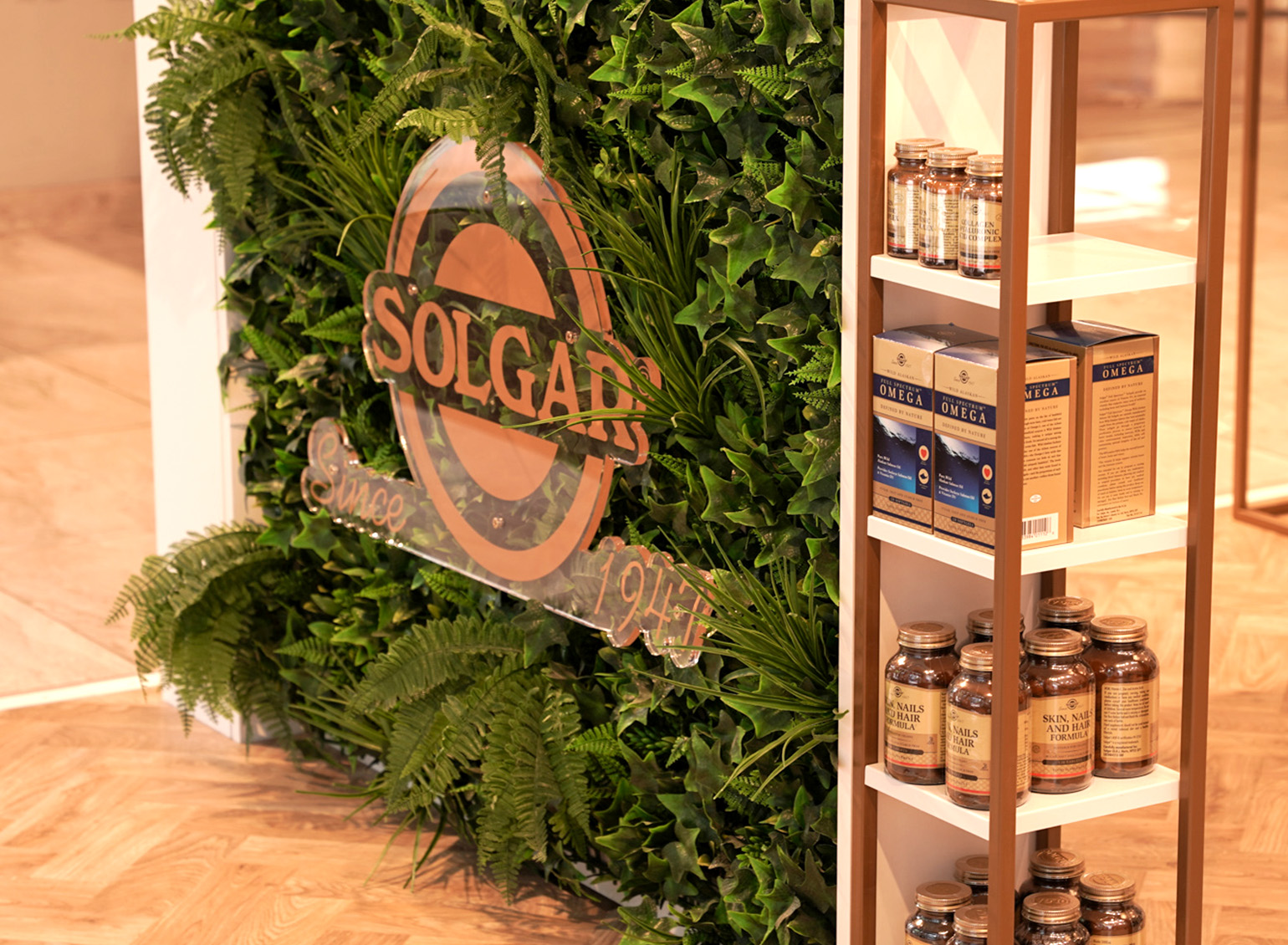The Solgar pop-up features a sophisticated white and gold colour palette that reinforces the brand’s premium positioning. To add warmth and a natural touch, we incorporated light wood flooring and a lush living wall, creating a tranquil atmosphere that aligns with Solgar’s focus on holistic health. This blend of luxury and nature gives the space a refined, welcoming ambiance that stands out in a clinical setting.