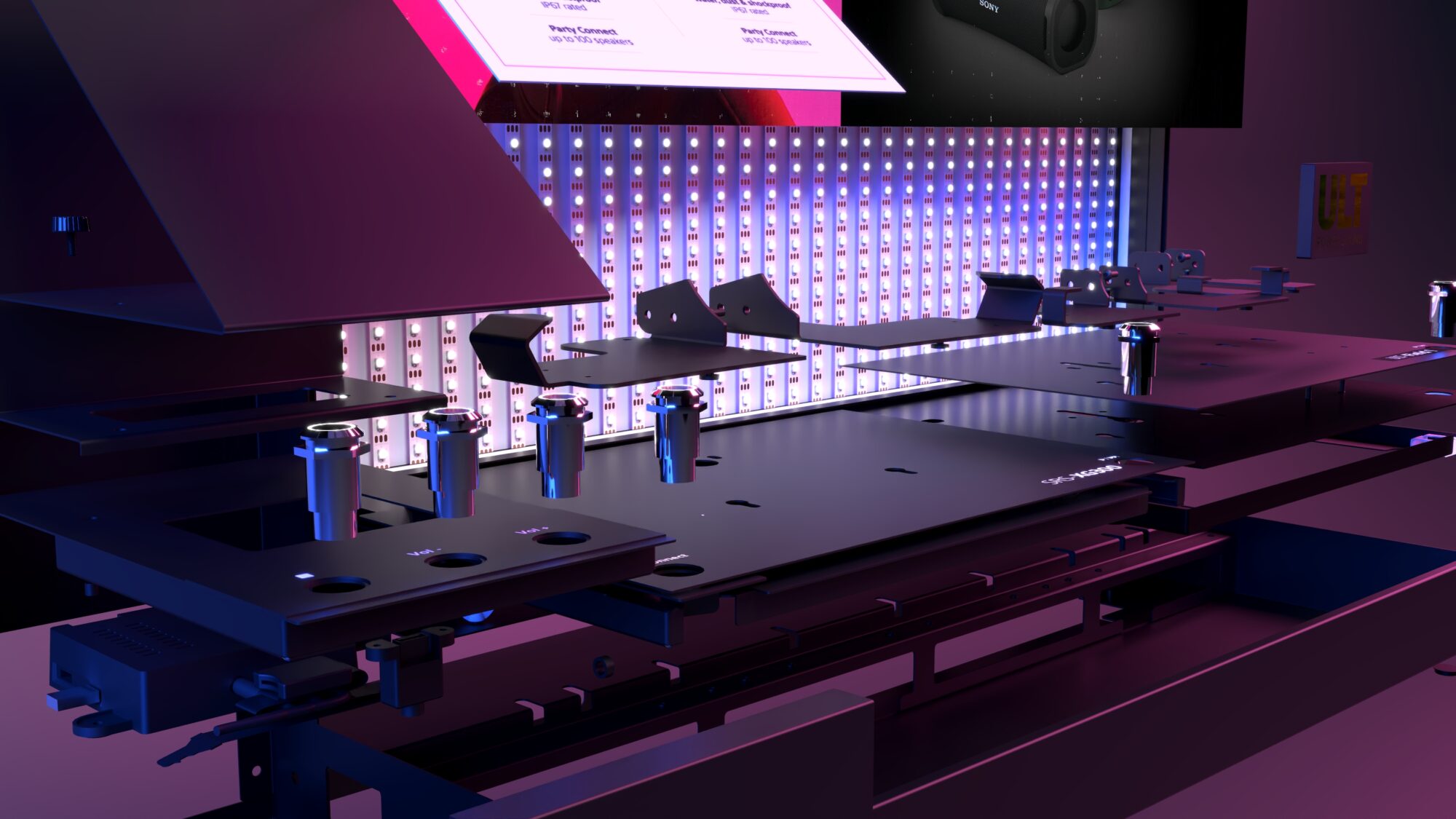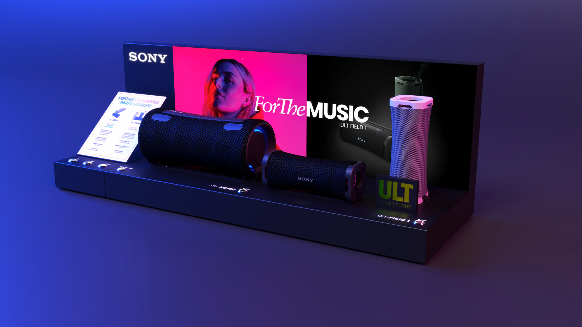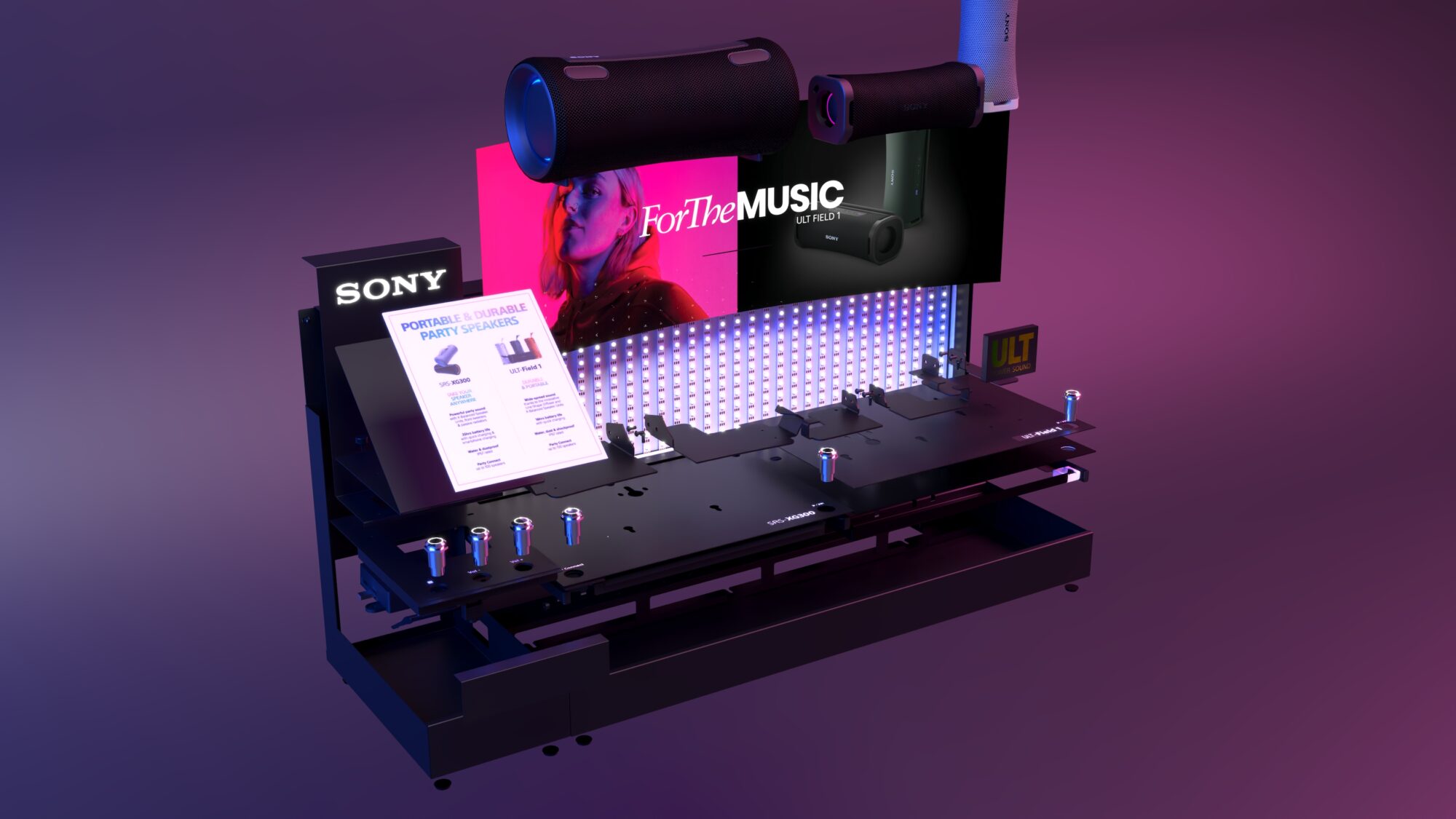 The digital interaction feature of the “Live Life Loud” display further exemplifies our modular approach: push buttons for sound experiences can be rearranged to suit new product ranges, making the unit adaptable to Sony’s evolving product line. This flexibility reduces the need for new materials and allows Sony to refresh the display.