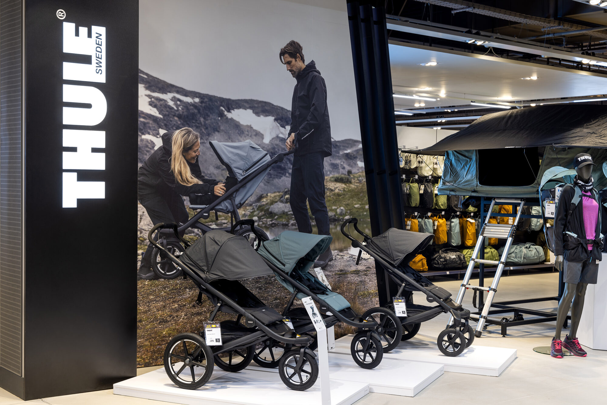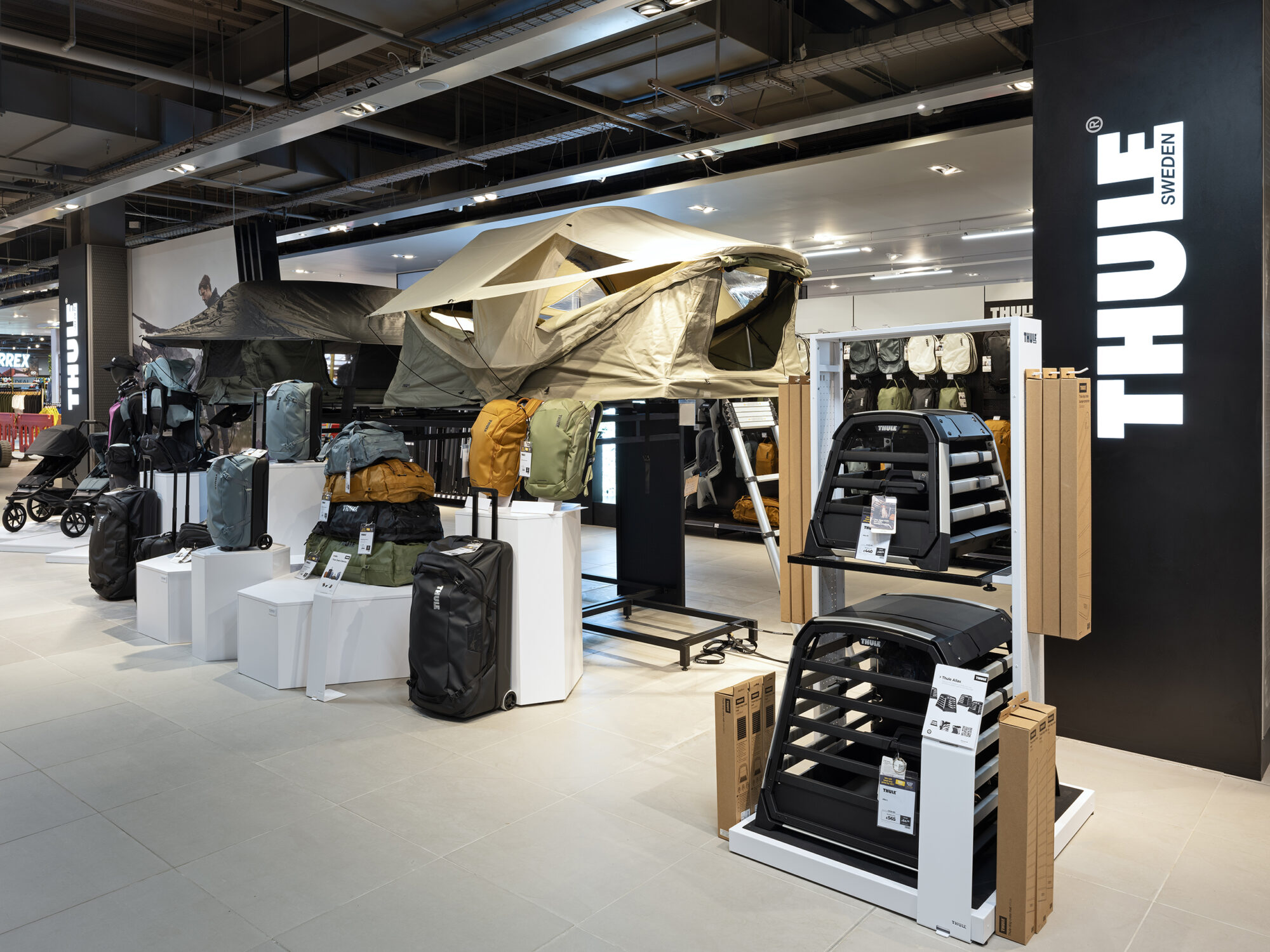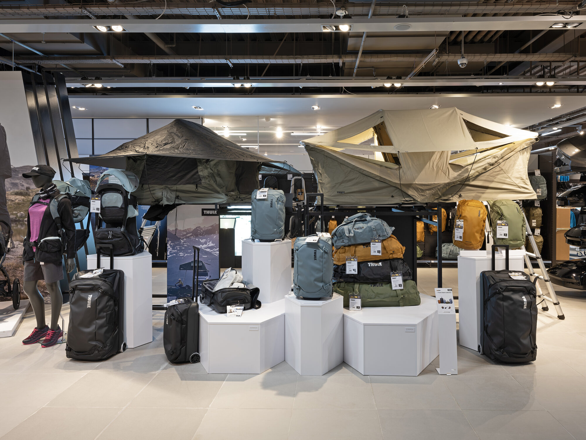 This project was an opportunity to showcase Thule’s comprehensive product range, including strollers, luggage, roof bars, bike carriers, dog cages, and tent boxes, all designed to support modern lifestyles and outdoor adventures. We structured the SIS into distinct, clearly labelled zones for each product category, ensuring easy navigation and a seamless shopping experience. Magnetic header graphics allowed for flexible updates, reinforcing Thule’s branding while accommodating future product changes. In line with Thule’s sustainability goals, the design integrated existing fixtures, repaired and repurposed client-supplied furniture, and incorporated newly crafted elements. This approach emphasized reuse, repair, and recycle principles, delivering a solution that aligned with both budgetary and environmental objectives.