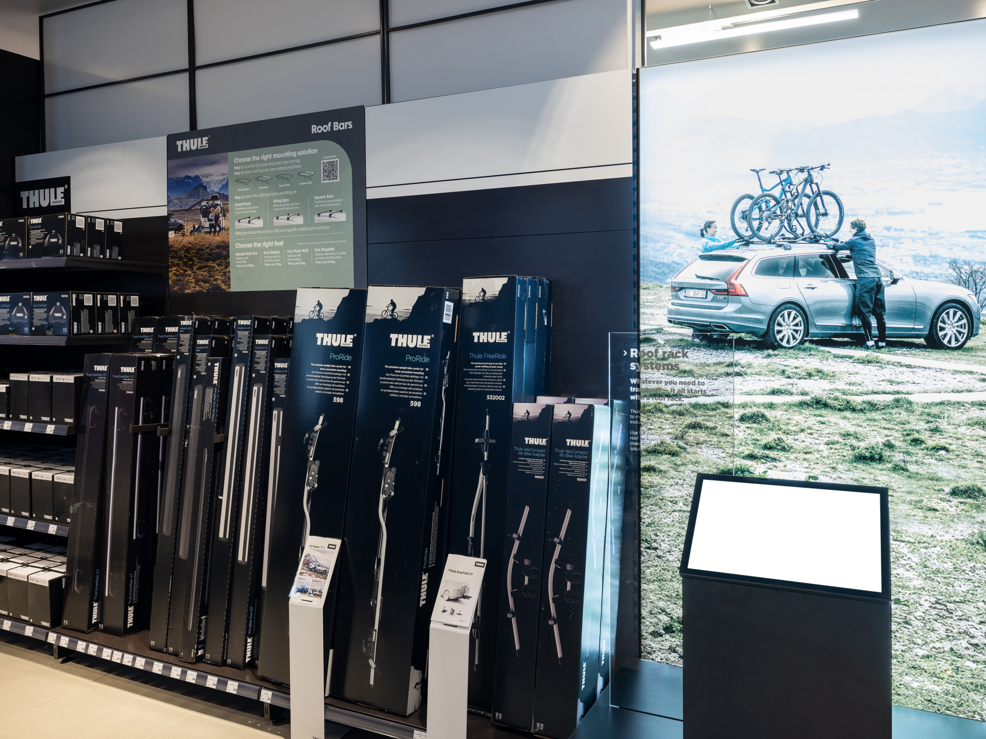 We also introduced an interactive touchscreen experience that allowed customers to explore Thule’s roof bar options using a vehicle specification app. By linking directly to the Thule website via a locked-down tablet, we created a seamless integration between digital and in-store experiences, empowering customers to make informed decisions.